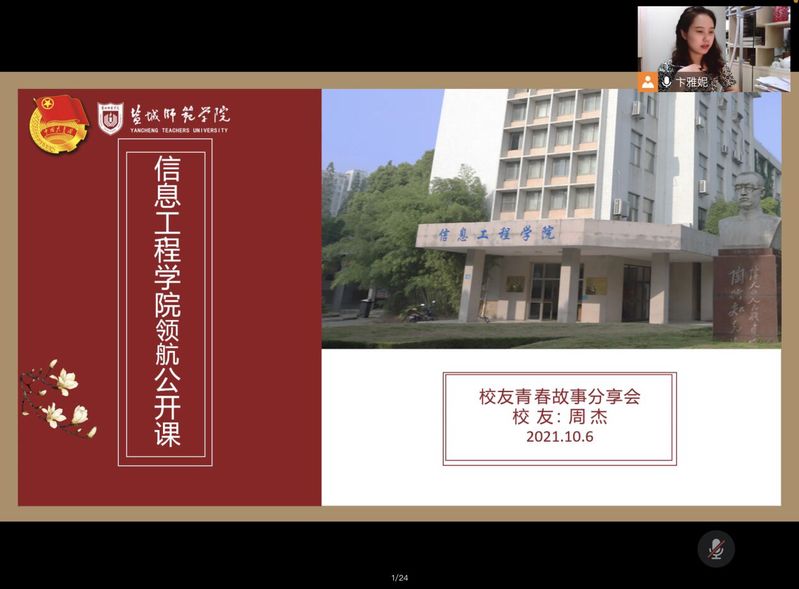 10月6日晚,信息工程学院集中开展“领航·开学第一课”校友青春故事分享线上教育活动,活动邀请原信息工程学院数字媒体技术专业158班,现复旦大学计算机科学与技术学院软件工程专业研三校友周杰,分享他的青春故事。学院2021级新生以及部分考研学子参加此次活动。活动由院团委书记卞雅妮主持。