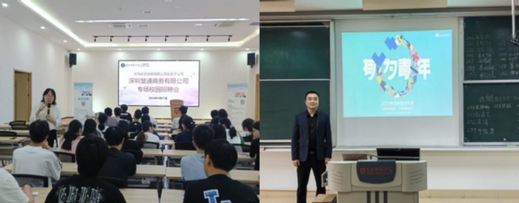 为精准对接2026届毕业生求职需求,提升就业竞争力,人工智能学院联合深圳慧通商务有限公司(华为全资子公司),于10月11日与29日分别在大数据产业园B16楼与通榆校区主楼举办简历制作与面试指导讲座暨专场招聘会。慧通公司盐城区域主管田海强、学院2023届校友王永林及HR陈洪受邀主讲,党委书记郭晓俐出席,200余名毕业生参与。