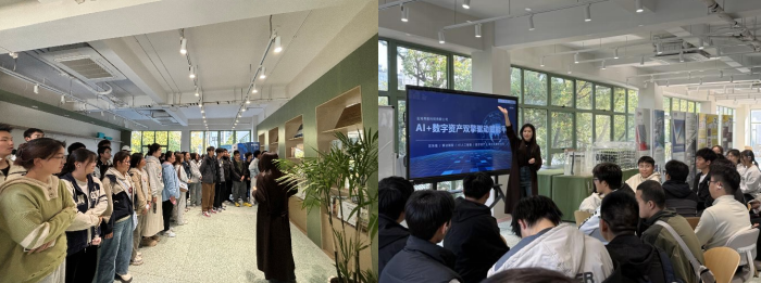活动分为企业参观、业务分享与互动交流三个环节。在企业参观中,园区负责人详细介绍了企业运营模式与科技创新成果,使学生对行业生态与岗位能力要求有了直观认识。业务分享环节,负责人结合“渎上老西门”IP形象大使“渎小西”、“数字人钱建军”等典型案例,系统阐释了视频制作、灵感星海APP、数字资产及品牌IP商业孵化等核心业务,并现场发布实习岗位,激发学生浓厚兴趣。互动环节气氛热烈,同学们围绕赛事参与、职业发展等话题踊跃提问,企业技术负责人就软件开发、算法应用等方向给予专业建议与指导。