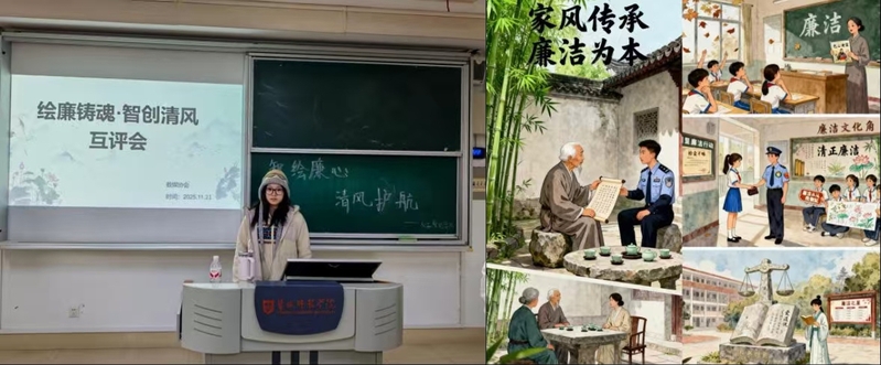 数媒协会开展AI创意绘画大赛,参赛者结合历史与校园元素,创作风格统一的数字作品。线下互评环节中,选手分享AI工具使用经验与创作过程,观众通过匿名评分参与互动,增强对廉洁理念的认知。