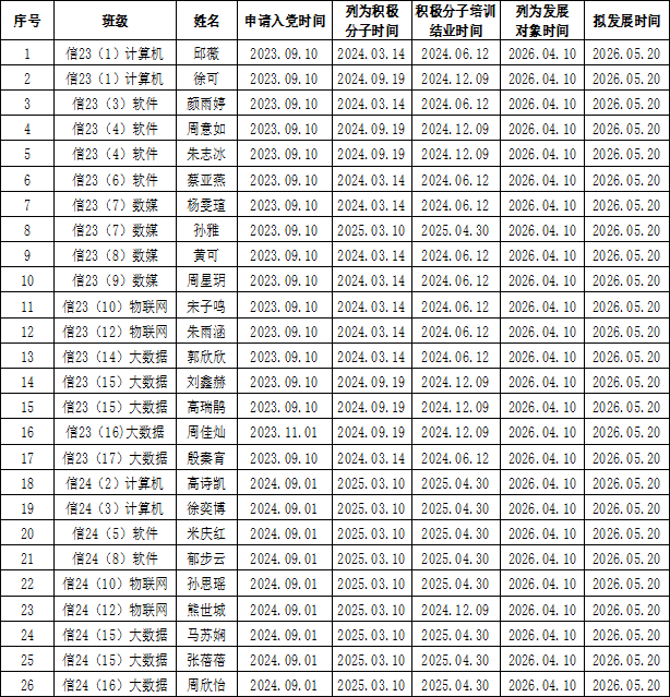 经党组织教育和考察、学院党委预审小组决议,拟接收邱薇、徐可、颜雨婷等26位同学为党员发展对象。现予以公示,公示时间:2026年4月10日至2026年4月15日。