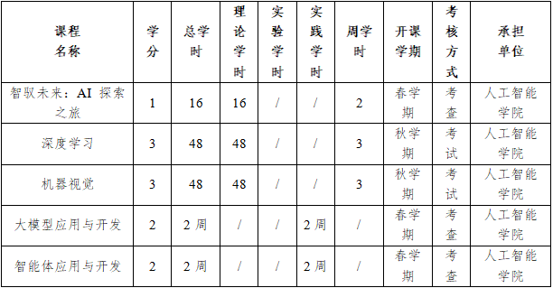 核心课程包括:智驭未来:AI 探索之旅、深度学习、机器视觉、大模型应用与开发、智能体应用与开发。具体课程安排如下所示。