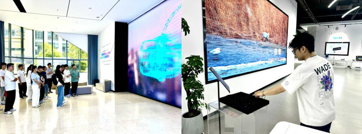 在长三角数字视听产业基地展厅,企业技术讲解员通过动态影像演示,从产业布局、技术研发到场景应用等多维度,系统介绍了数字视听领域的发展现状与未来趋势。随后,师生进入三大核心体验区,在VR飞行模拟舱,学生们佩戴智能眼镜,通过虚拟现实技术模拟真实飞行场景,感受空域环境与操作流程;在3D建模工作台前,学生们在技术人员的指导下,借助VR虚拟眼镜参与快速建模实践,并深入了解3D真人手部建模技术的实现原理;AI化学实验平台则通过智能交互设备,让学生们自主完成模拟化学实验,直观体会人工智能与教育场景的深度融合。